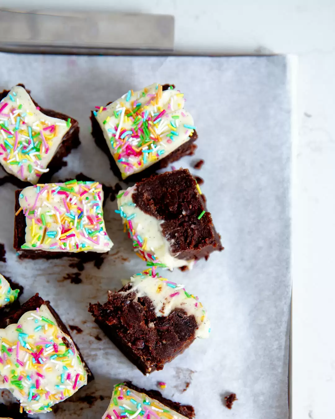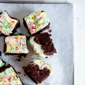 Dessa brownies är glutenfria, sötade med kokossocker och björksocker och utan ägg. På toppen är det vanligt strössel – det tycker jag att man kan man unna sig på sin födelsedag, speciellt när man stoppat bönor i smeten 🤸♀️