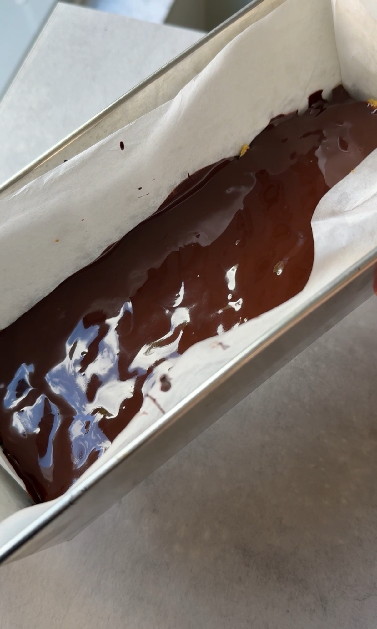 Klä alltid formen med bakplåtspapper, då får du raka kanter och lättare att skära i fina bitar (se min reel).