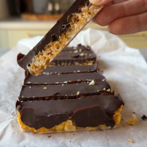 Smält chokladen ihop med kokosoljan och häll den sedan i formen så att det täcker botten. Ställ i kyl minst 2 timmar. Skär upp i bars.