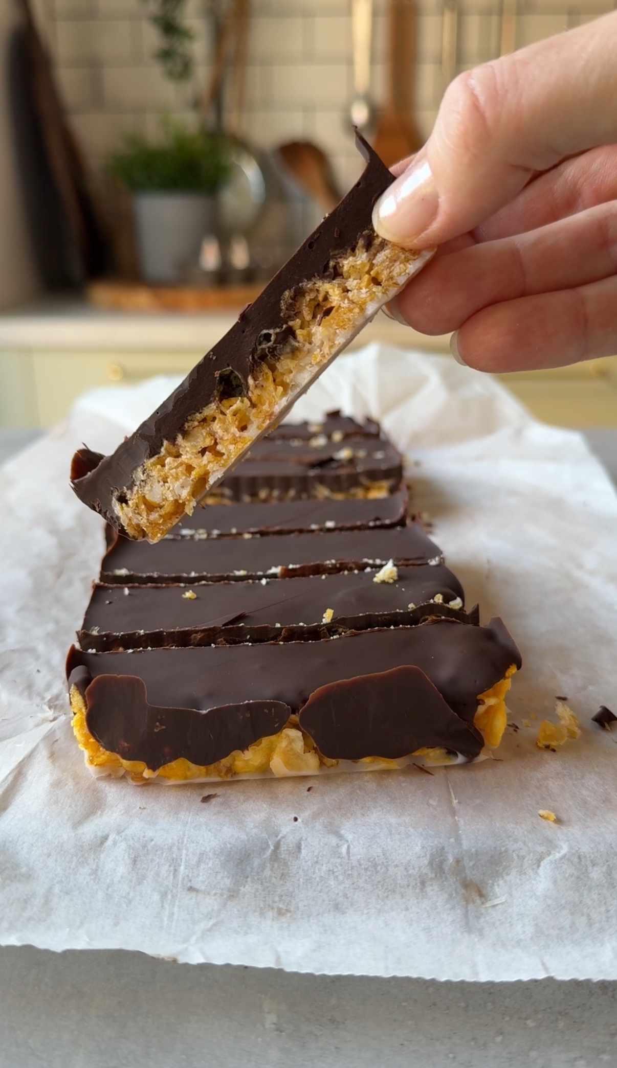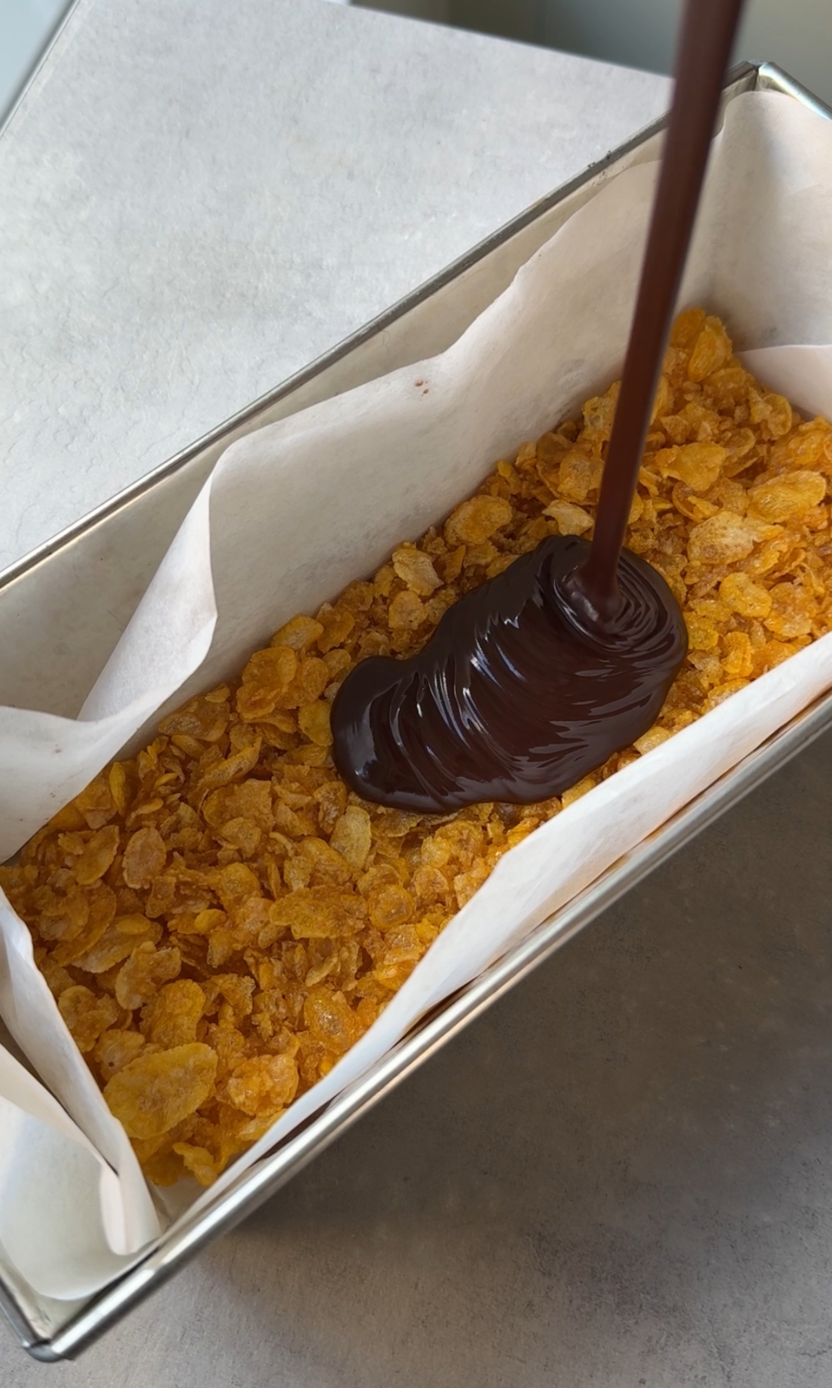 Trots att cornflakesfyllningen bakas i ugnen behåller den ett fantastiskt krisp. När du sedan doppar eller brer på chokladen får du den där perfekta kontrasten mellan knaprigt och lent, en riktig drömkombination.