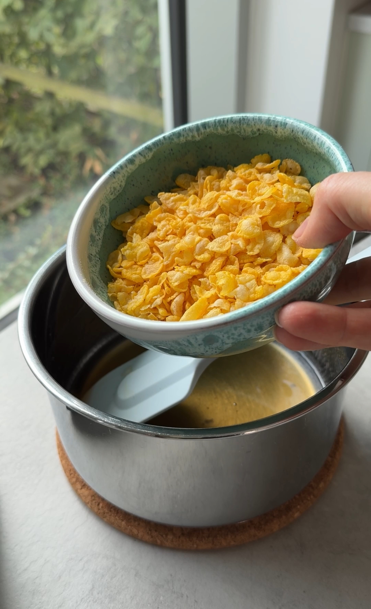 Krossa hälften av cornflakesen och behåll resten i den storlek de är. Rör ner i kastrullen. Detta kommer göra att barsen håller ihop bättre.