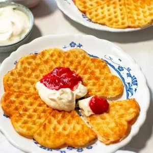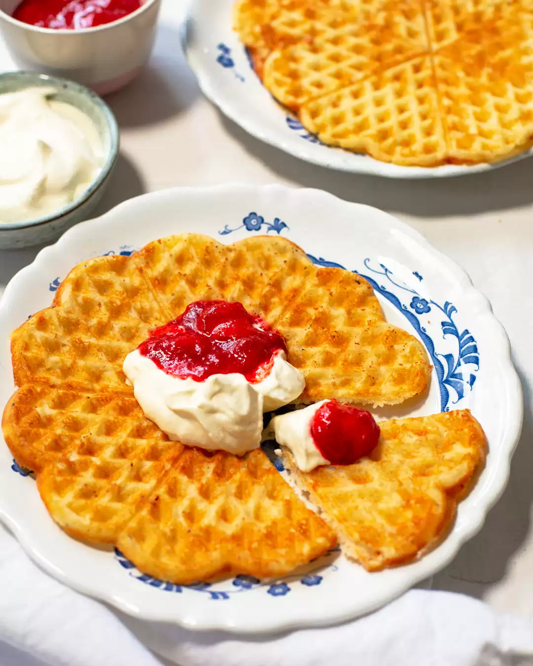 Våfflorna är magiskt goda att äta med lättvispad grädde och jordgubbskompott som du hittar recept på nedan.