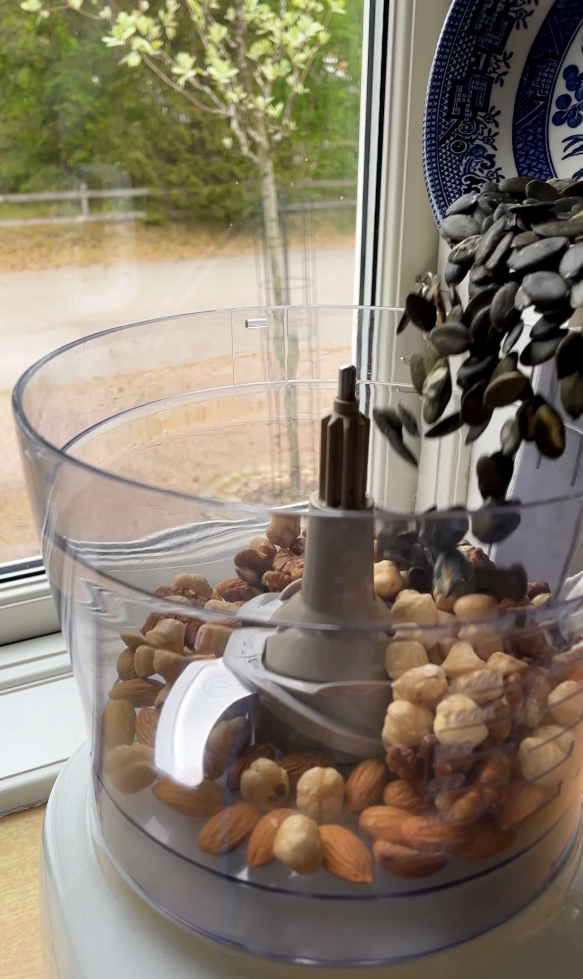 Häll nötter, pumpakärnor och havregryn i en matberedare. Pulskör tills de motsvarar finhackat.