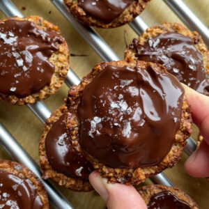 Smält chokladen. Se tips i högre upp på sidan för hur du gör en enkel temperering. Häll ovanpå kakorna och toppa med lite flingsalt. Kyl tills chokladen stelnat om du inte tempererar chokladen.