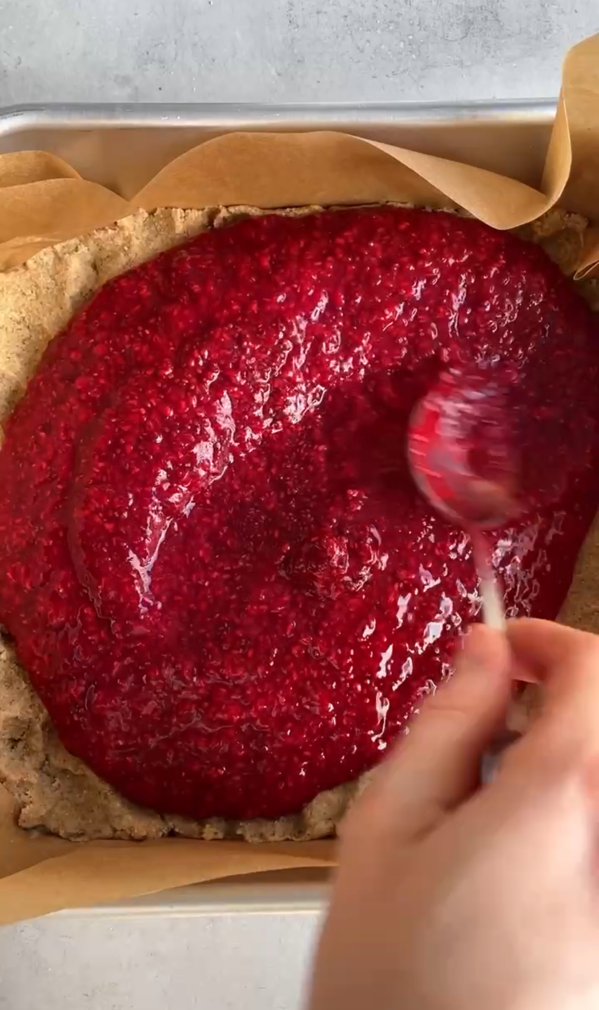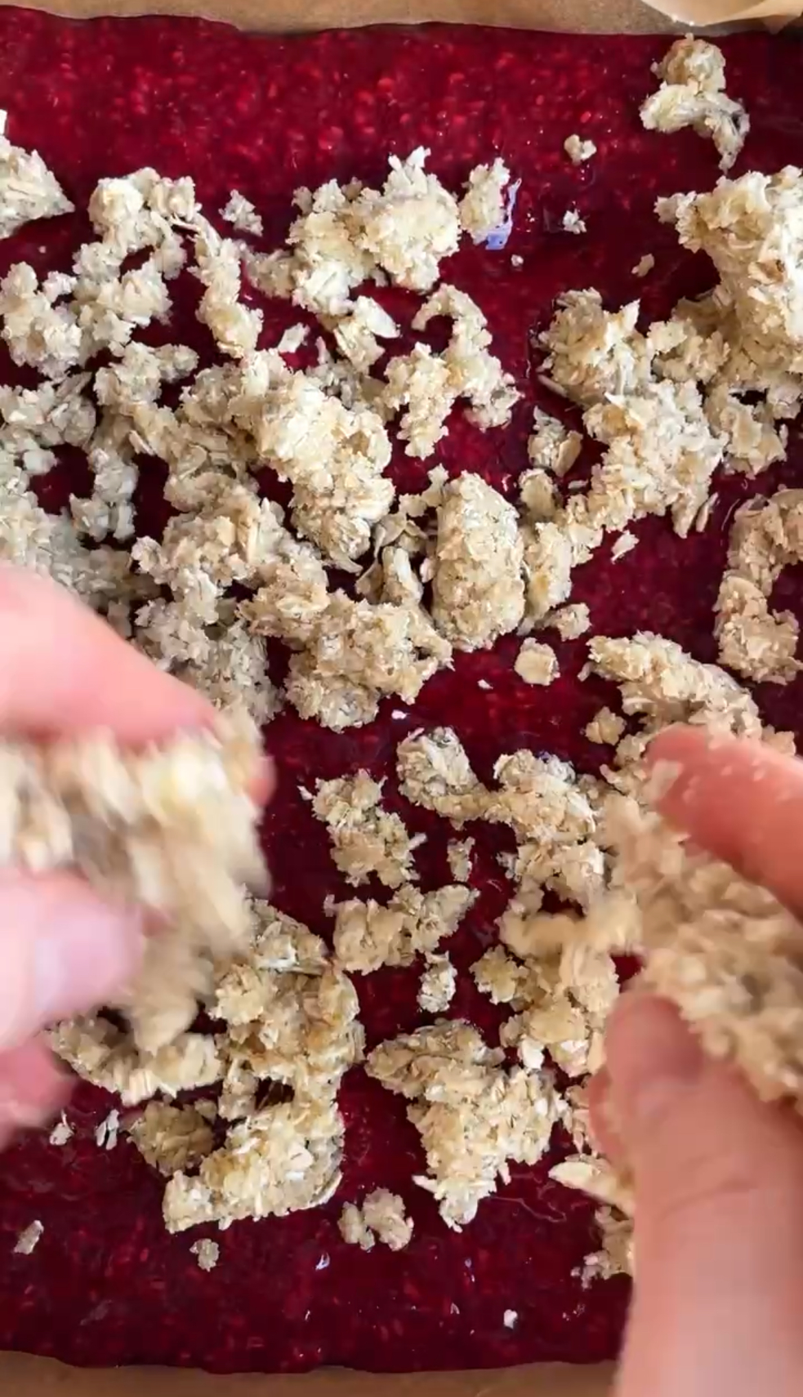 Häll hallonsylten över mördegsbotten och täck sedan med smuldeg i ett jämnt lager.