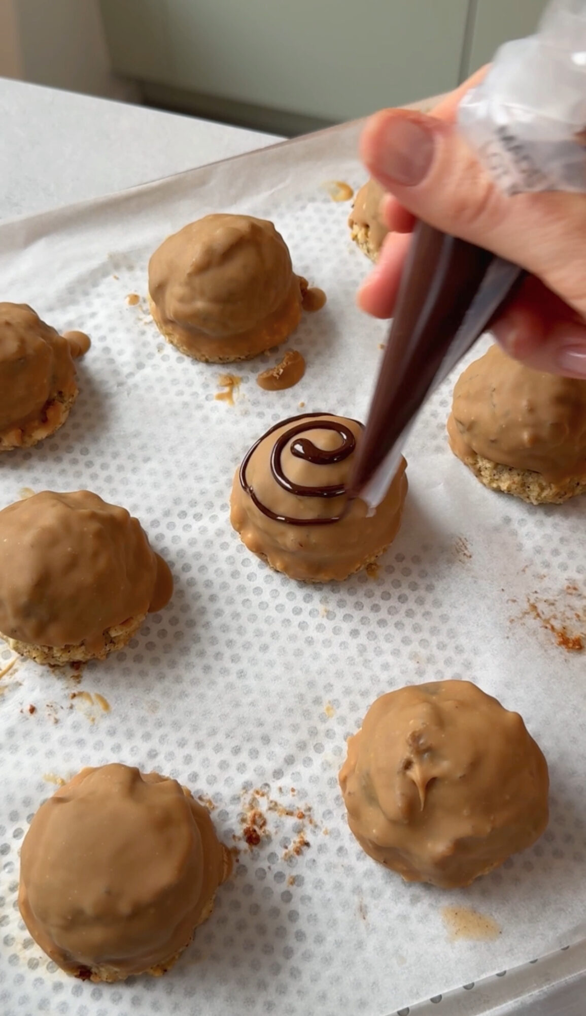 Smält sedan den mörka chokladen. Häll över i spritspåse och klipp ett litet hål. Ringla som en kanelbullesnurra ovanpå varje biskvi. Strö direkt över pärlsocker.