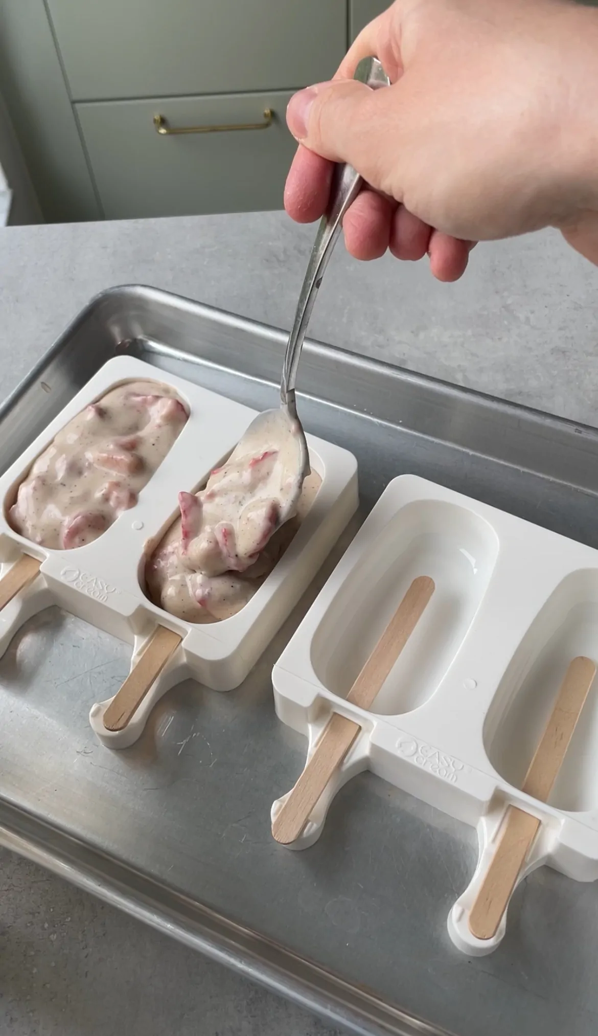 Häll över i en kanna så blir det enklare att fylla glassformarna. Frys in över natten.