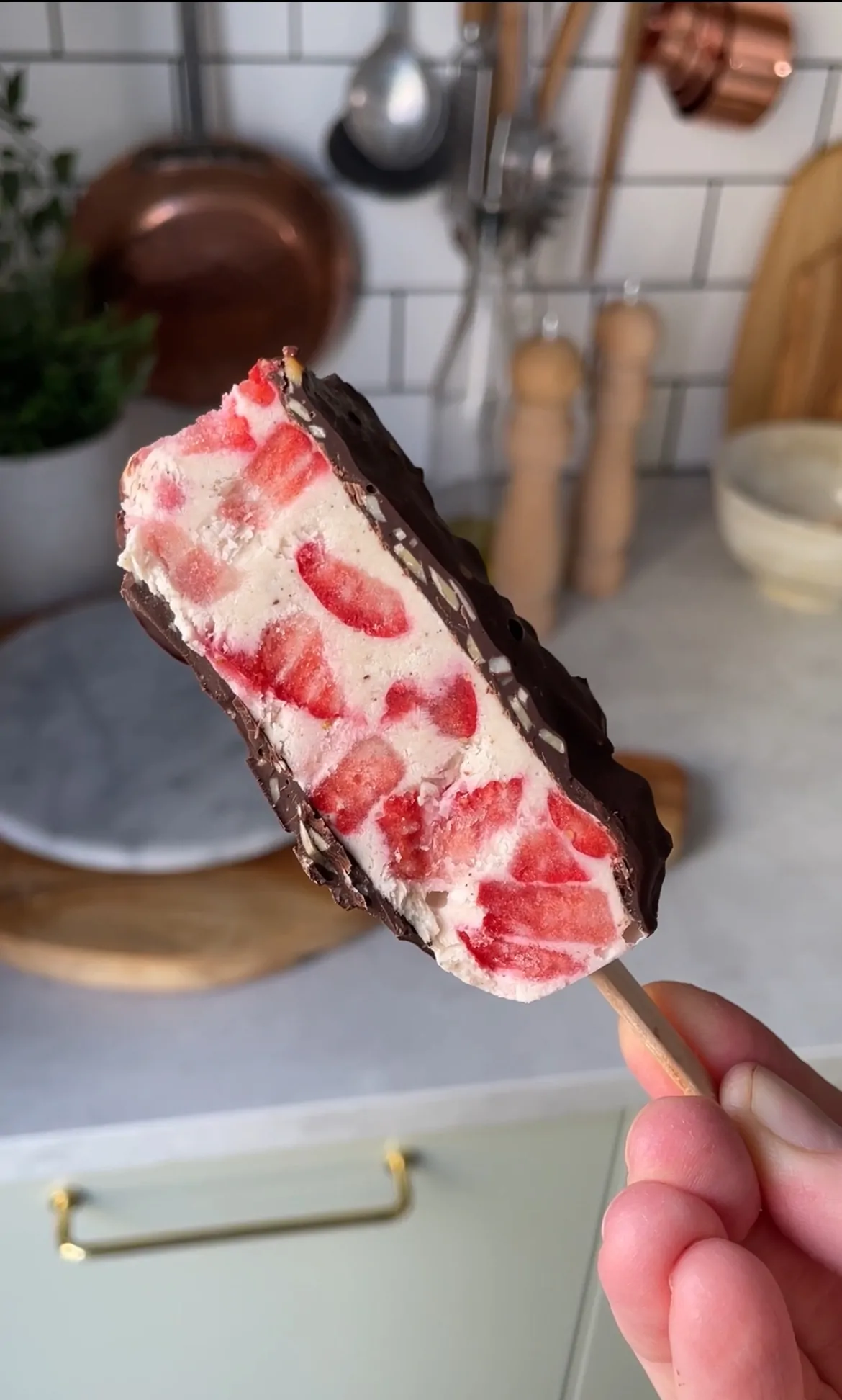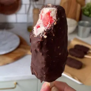 Ljuvliga Magnum-inspirerade glassar som är perfekta för sommaren! Dessa glassar har en krämig konsistens och en härlig smak av jordgubb, doppade i ett täcke av mörk choklad och knapriga mandlar. Och bäst av allt? Du behöver ingen glassmaskin!
