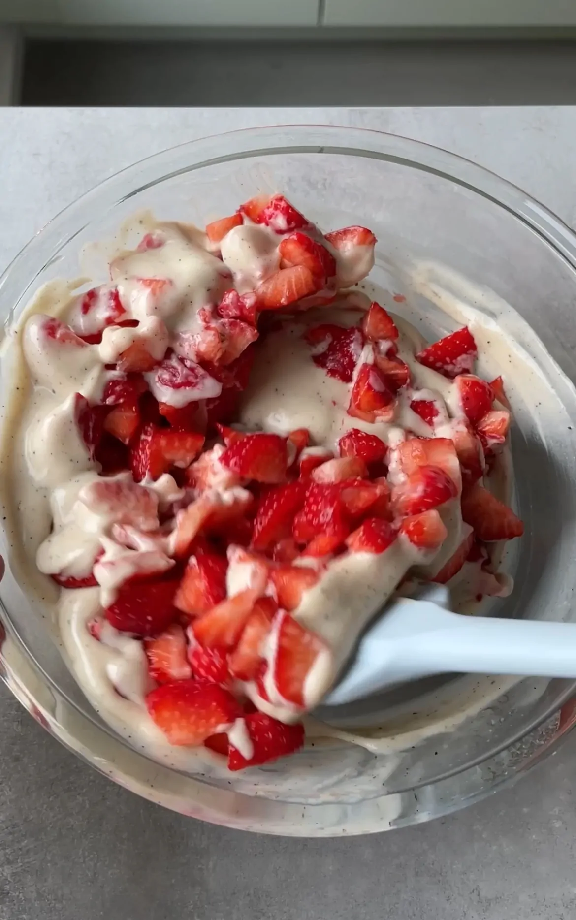 Rör ihop samtliga ingredienser för glassmeten, enklast är att använda en ballongvisp för att få en slät smet.