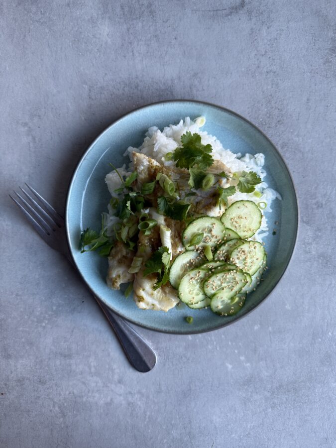 Ugnsbakad asiatisk fisk med ingefära, lime & krispig gurksallad (4 port)
