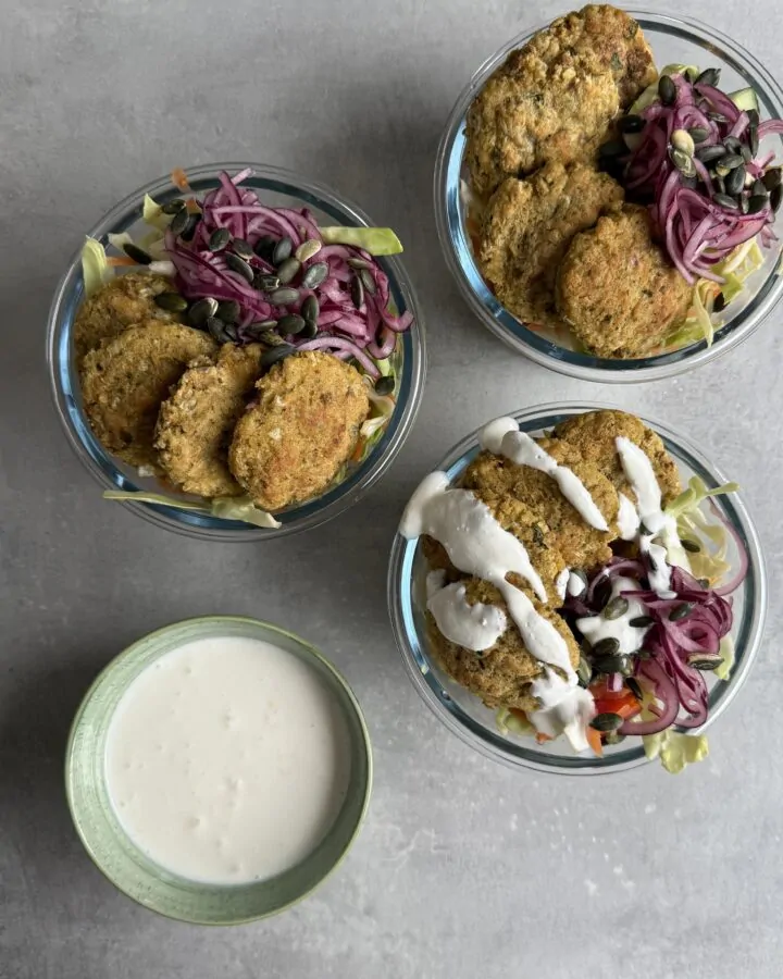 6. Fördela i matlådor: grönsaker, falafel, rödlök och sås.