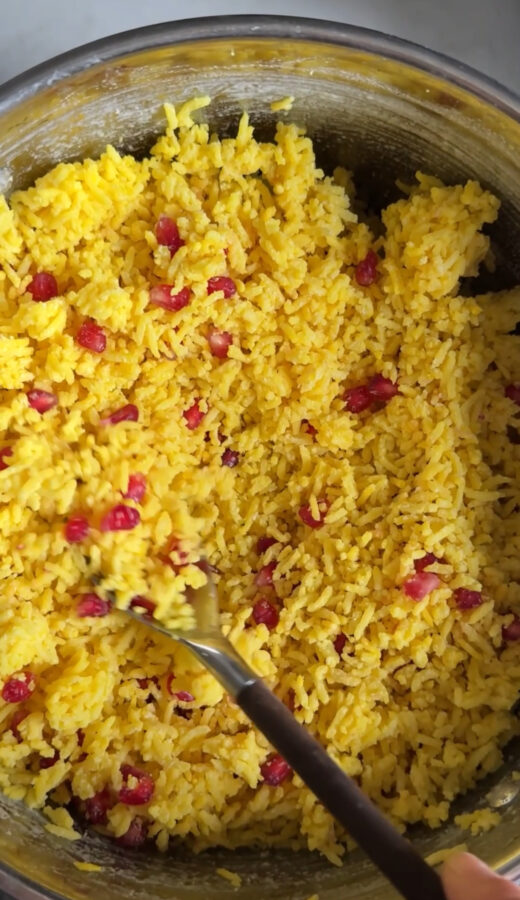 Skölj riset och häll i en kastrull tillsammans med kokosmjölk, vatten, salt och saffran. Låt koka upp, rör runt och lägg på locket. Sjud ca 12 minuter på låg värme eller tills vätskan har absorberats. Ta av från värmen och låt stå fem minuter innan servering. Vänd ner granatäpplekärnor