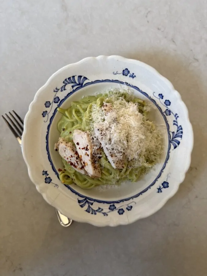 Vid middagstid: Blanda såsen med nykokt pasta vid servering och toppa med tunt skivad kyckling och parmesan.