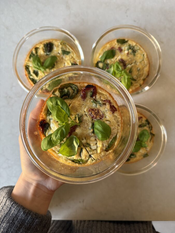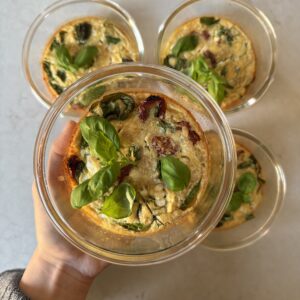 Rör ner keso, fetaost, soltorkad tomat och basilika.