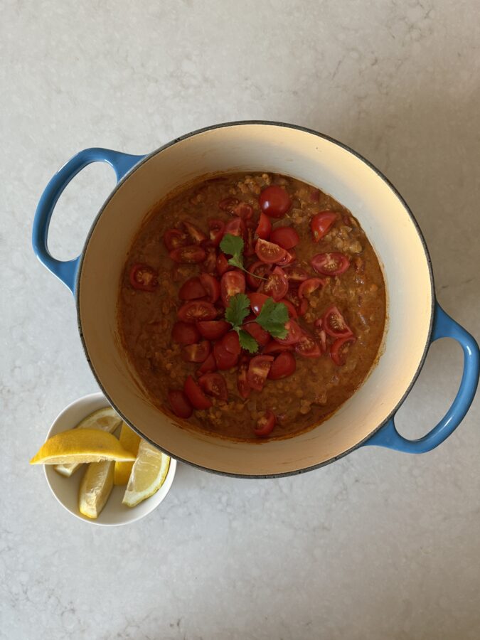 Låt sjuda 15–20 min tills linserna är mjuka. Skär upp småtomater i mindre bitar och rör ner mot slutet.