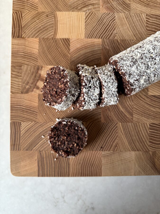 Mixa alla ingredienser i en matberedare till en jämn massa. Testa med en liten bit att den går enkel att rulla, känns den för torr så tillsätt en liten skvätt extra kaffe. Rulla till en jämnstor rulle och rulla därefter i kokos.