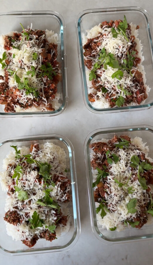 Koka ris enligt instruktionerna på förpackningen. Fördela jämnt i fyra matlådor. Fördela köttfärssåsen över och strö över parmesan.