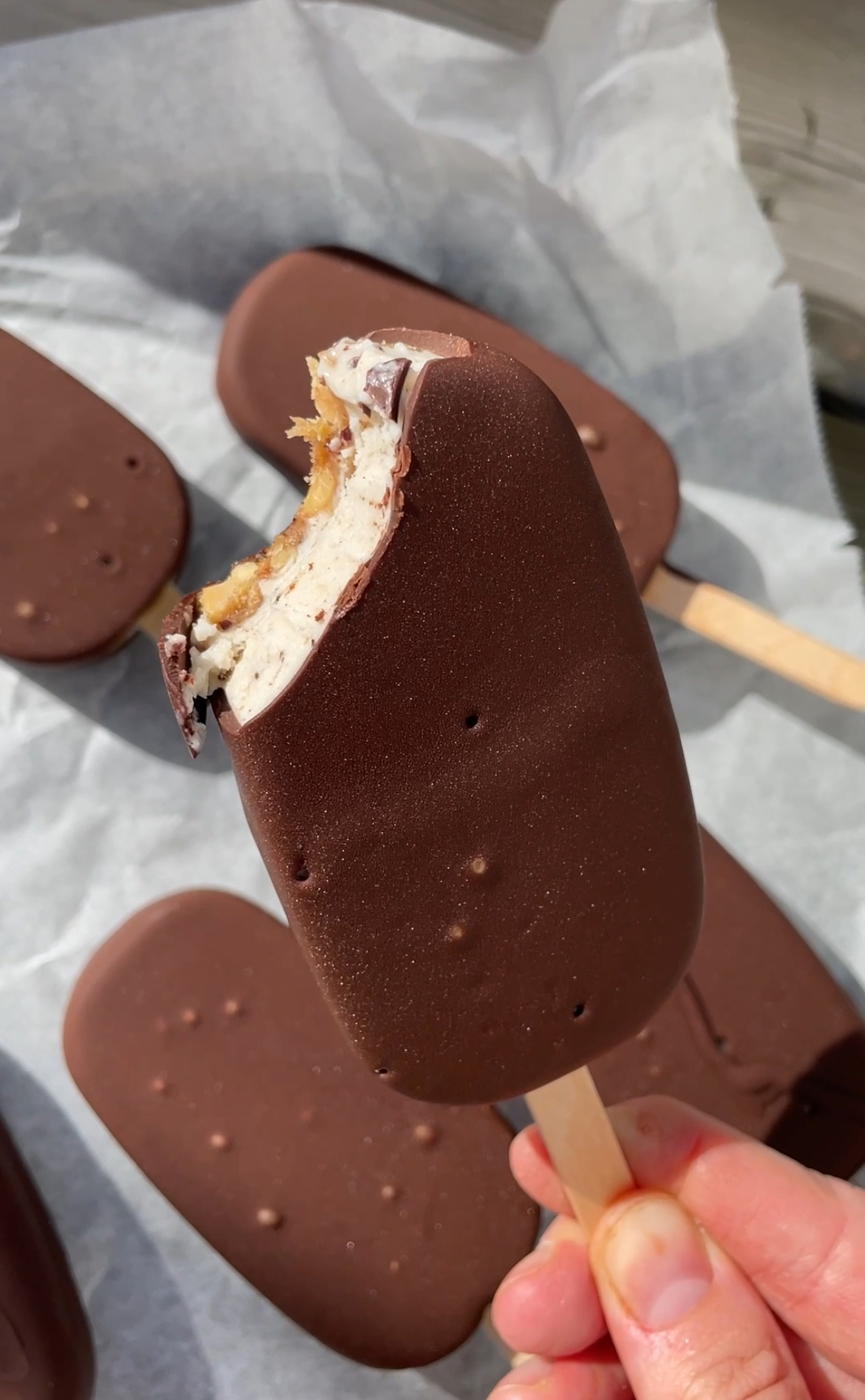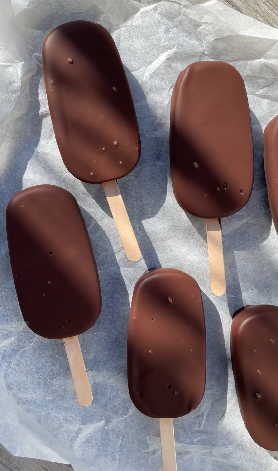 Se till att chokladen är varm men inte het – efter ungefär hälften av glassarna kan du behöva värma på den några sekunder i mikron igen för att få ett jämnt, tunt skal.