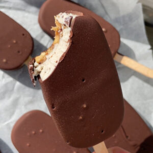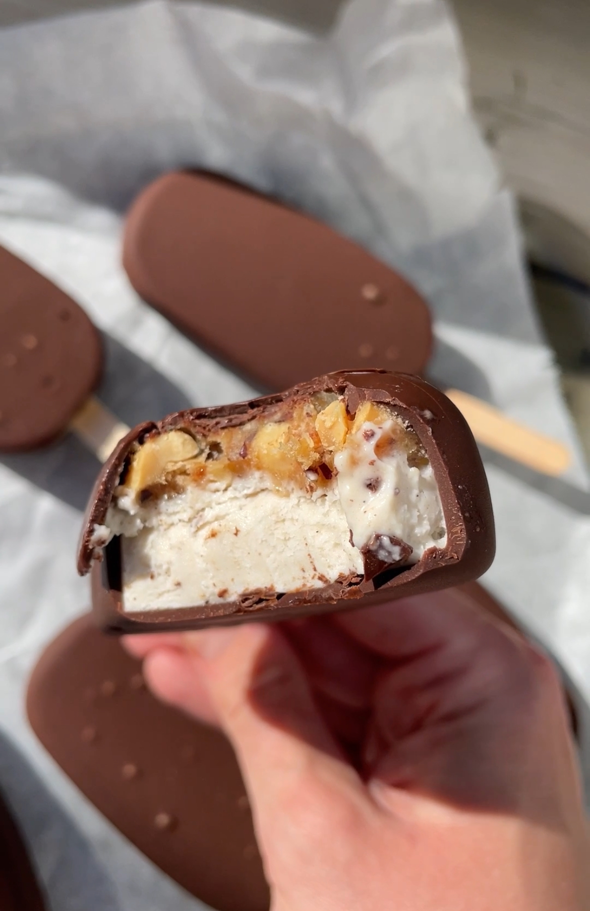 Mina absolut godaste snickersglassar! 🍦 Det sega kola- och jordnötslagret fryser inte helt, utan blir sådär härligt mjukt och kolaaktigt – precis som man vill ha det. Har du chokladen tillräckligt varm när du doppar dem får du ett tunt, knäckigt skal som ger perfekt tuggmotstånd.