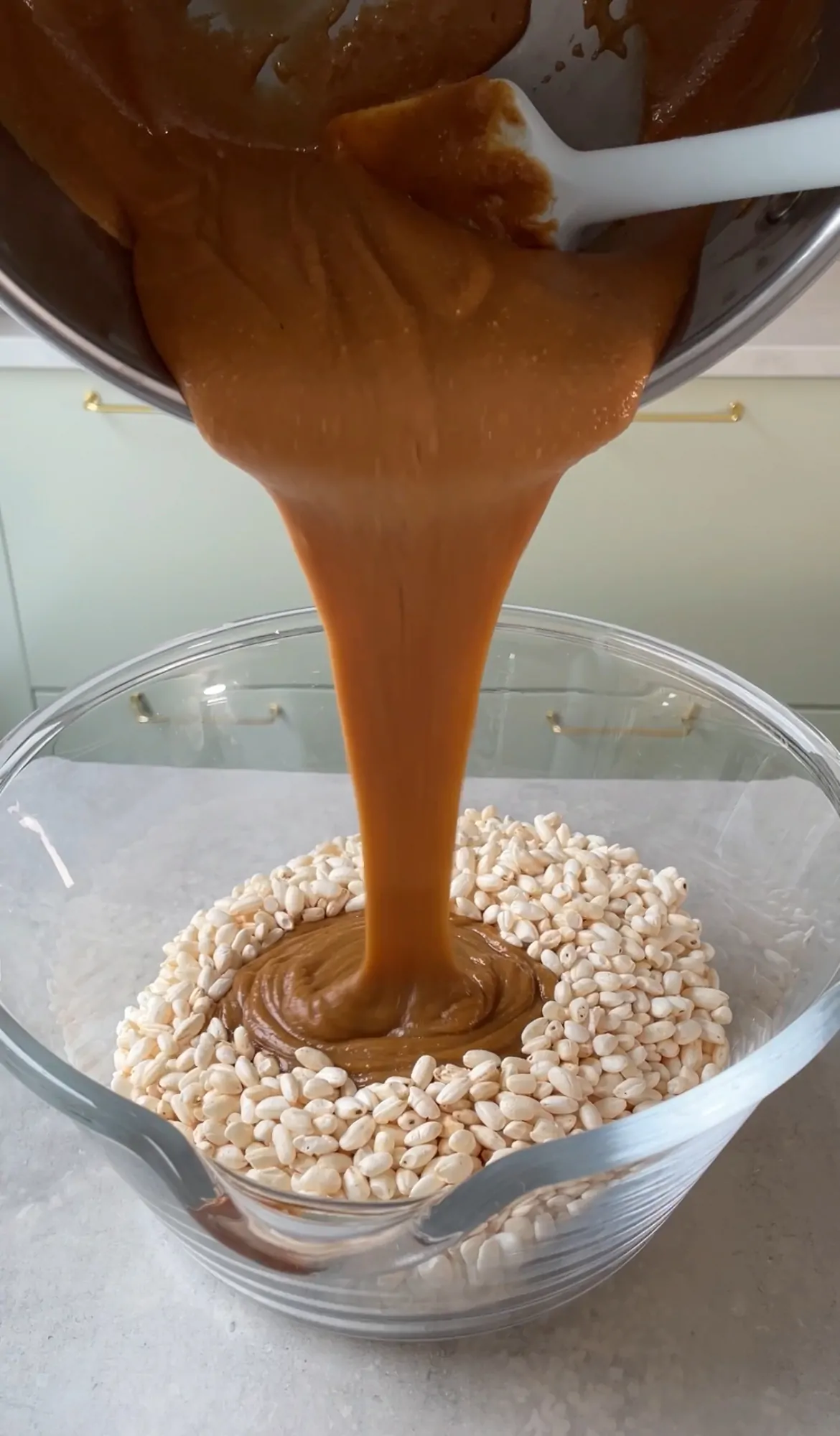 Värm jordnötssmör, lönnsirap, kokossocker och salt i en kastrull på medelvärme under omrörning tills sockret smält. Häll ner i bunken med rispuffarna och blanda noga.